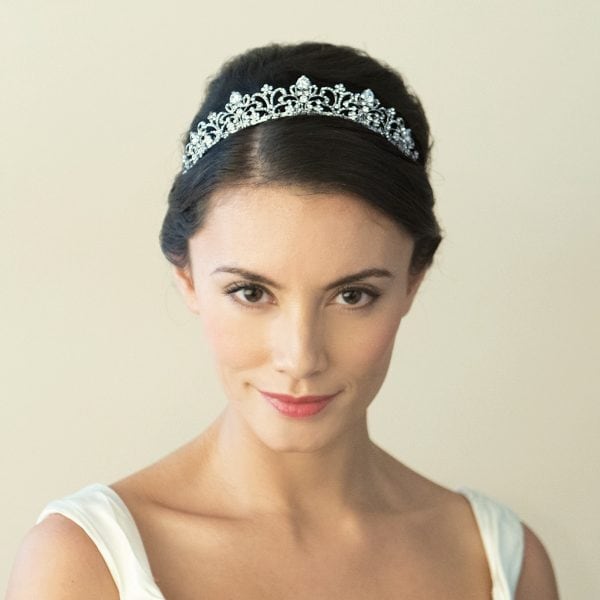 柔らかな曲線を多用した曲線美と可憐な花モチーフの繊細な意匠が凝らされたこのティアラは、まとめ髪のヘアスタイルと非常に相性が良いので、様々なシニヨンアレンジに合わせていただけます。