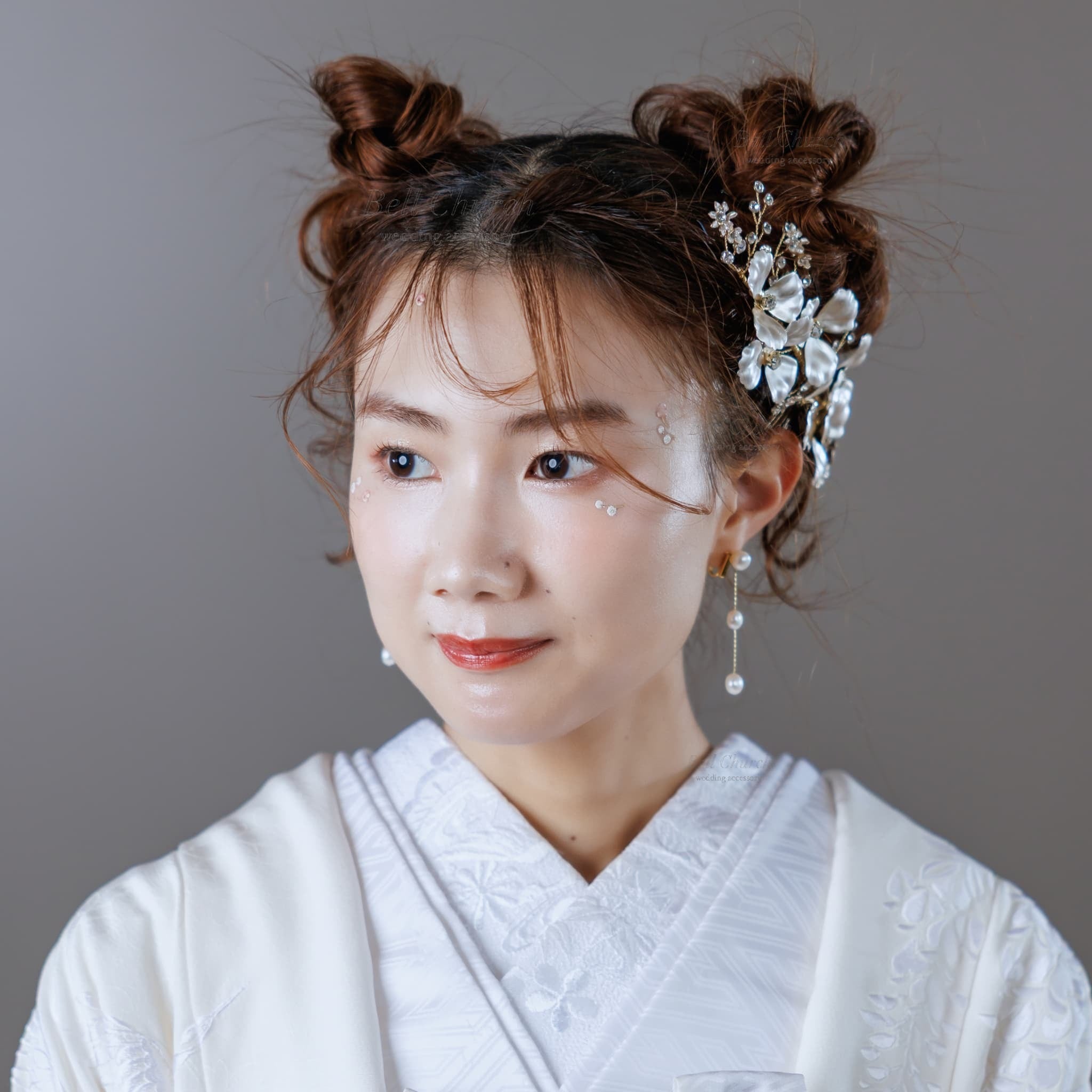 中央にラインストーンをセットした3枚花弁のお花モチーフを幾重にも重ね、異なる表情の小ぶりなフラワーモチーフとラインストーンで繊細な枝分かれを表現しています。