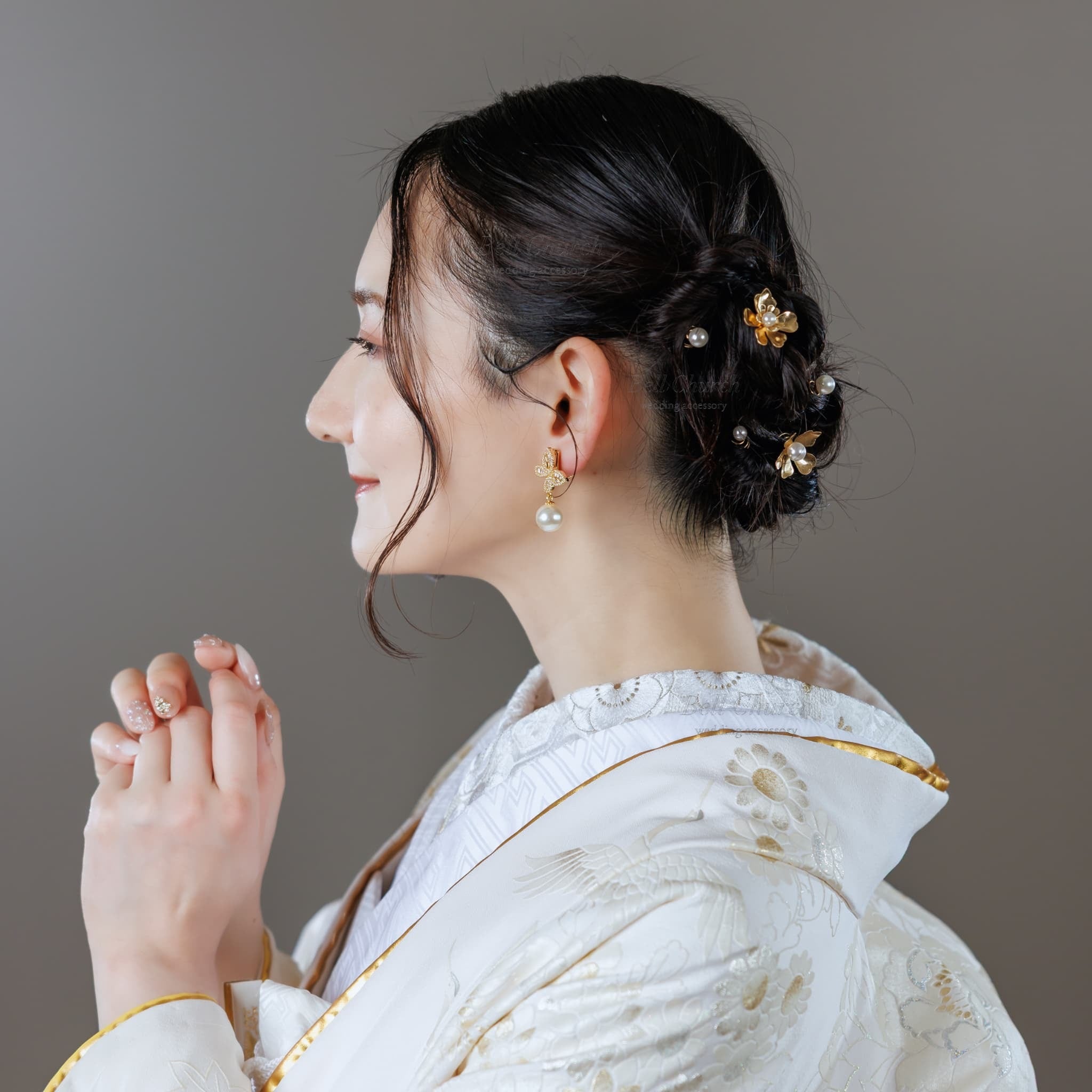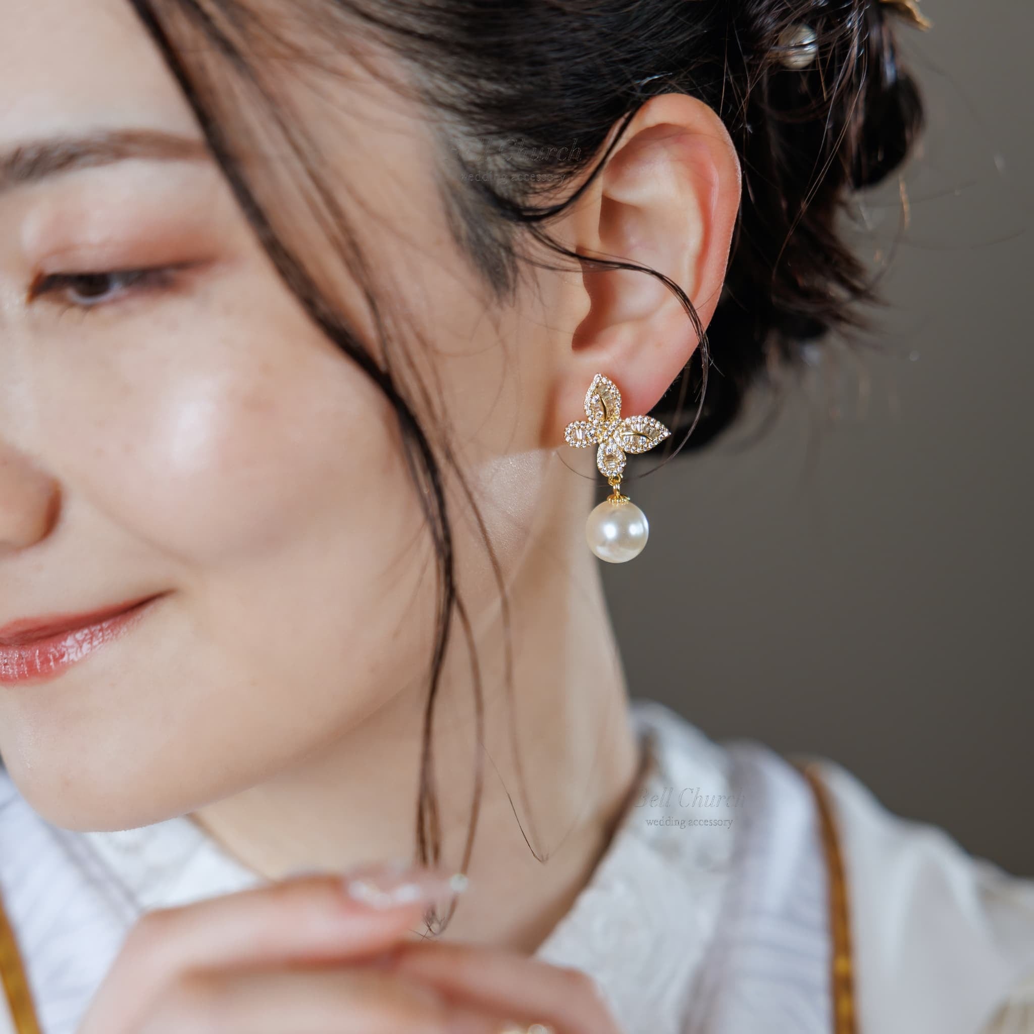 一匹のジルコニアの蝶にパールがあしらわれた、シンプルでありながらもかわいらしく、ゴージャスな印象を与えるゴールドのピアス・イヤリング。