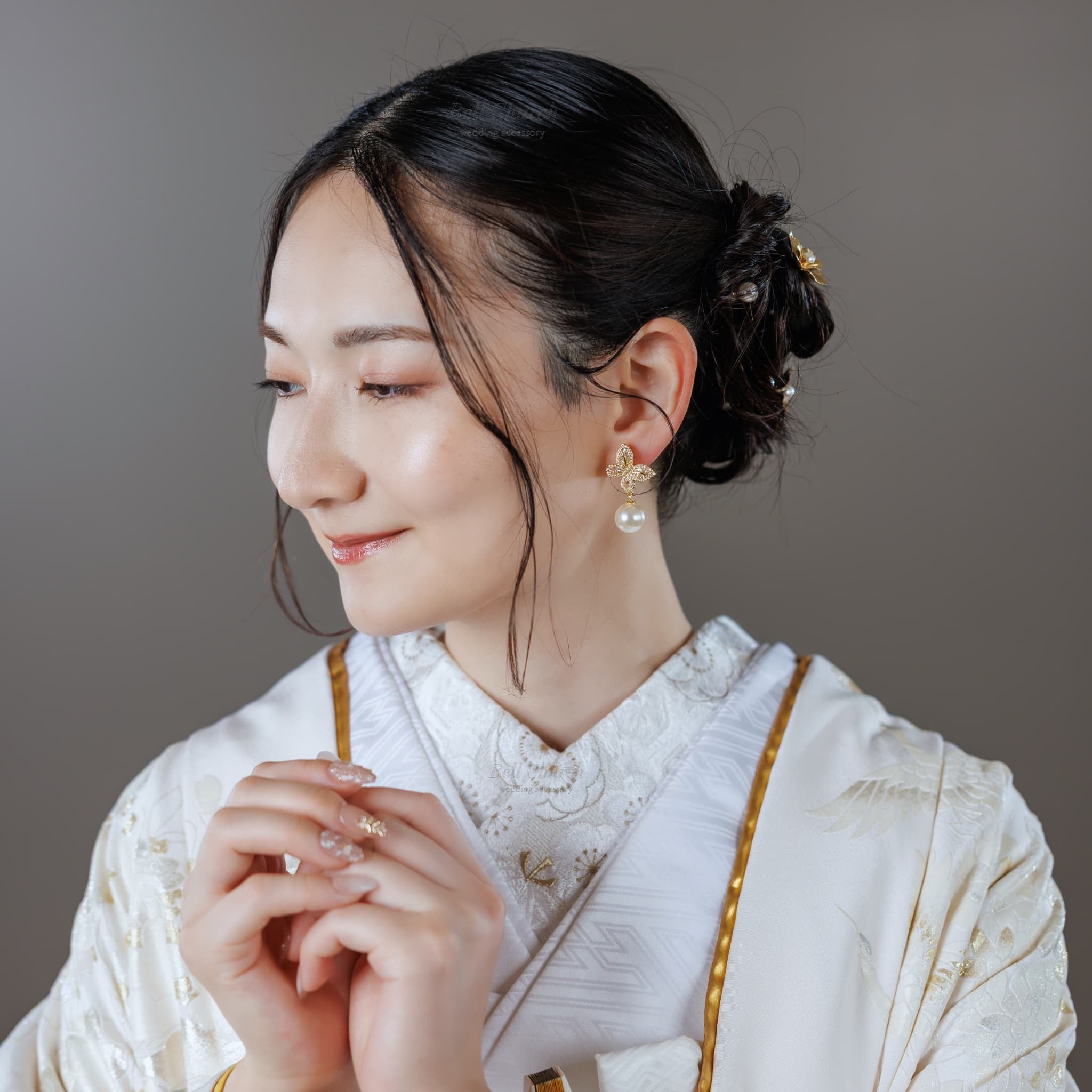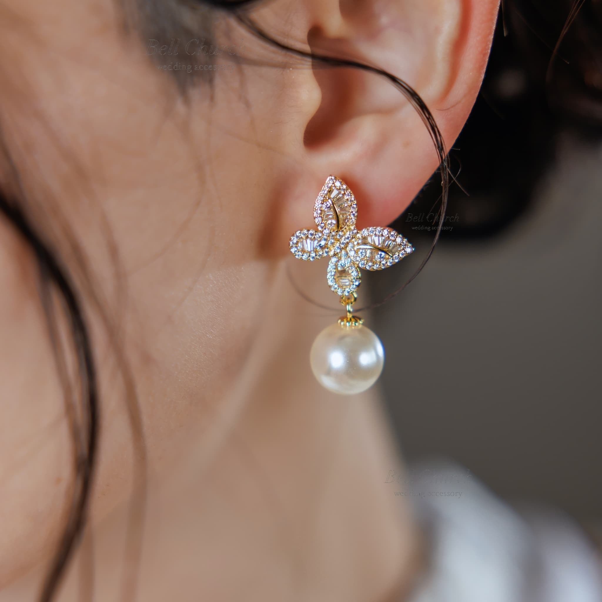 ブライダルピアス イヤリング|ジルコニア パール|バタフライ 蝶々モチーフ|ゴールド(BC-E125)