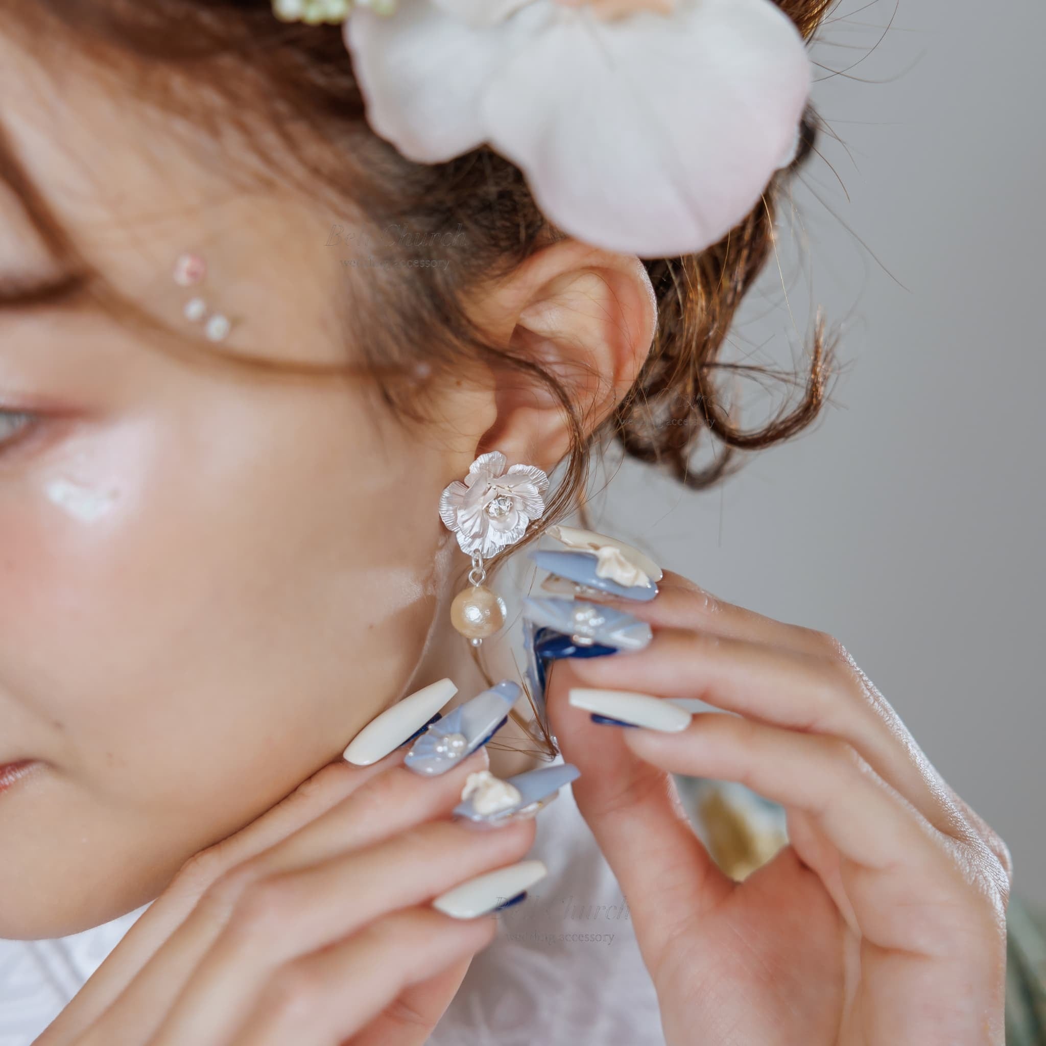 一輪のお花の花びらが重なりふんわりと花開き、先端のパールが可憐な印象を与えるかわいらしいデザインのシルバーピアス・イヤリング。